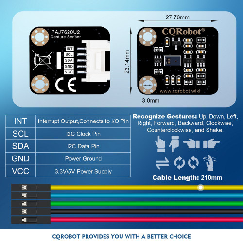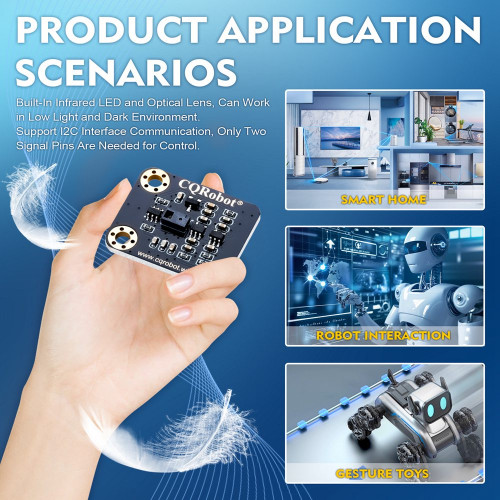 CQRPAJ7620U2 is a 3D gesture recognition sensor with integrated PAJ7620U2 chip, PAJ7620U2 integrates the gesture recognition function and the universal I2C interface into one chip. It can recognize 9 gestures, including move up, move down, move left, move right, move forward, move backward, rotate clockwise, rotate counterclockwise, and waveform. These gesture information can be easily accessed through the I2C bus. PAJ7620U2 also provides built-in proximity detection for sensing objects approaching or leaving. PAJ7620U2 has great flexibility in power saving institutions.