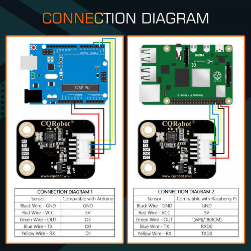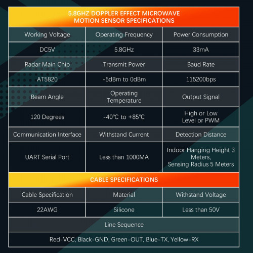 - Line Sequence: Red-VCC, Black-GND, Green-OUT, Blue-TX, Yellow-RX.