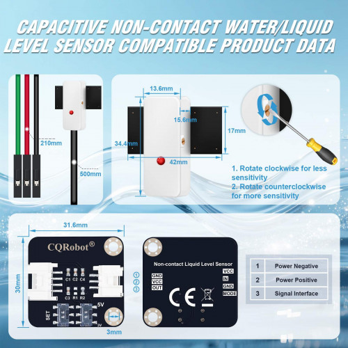 Wiki: http://www.cqrobot.wiki/index.php/Non-Contact_Water/Liquid_Level_Sensor_SKU:_CQRSENYW001