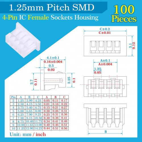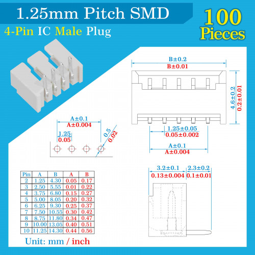 1 * 1.25 mm Pitch 4 Pin SMD Connector kit (100 Sets/600 Pieces)