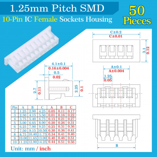 1 * 1.25 mm Pitch 10 Pin SMD Connector kit (50 Sets/600 Pieces)