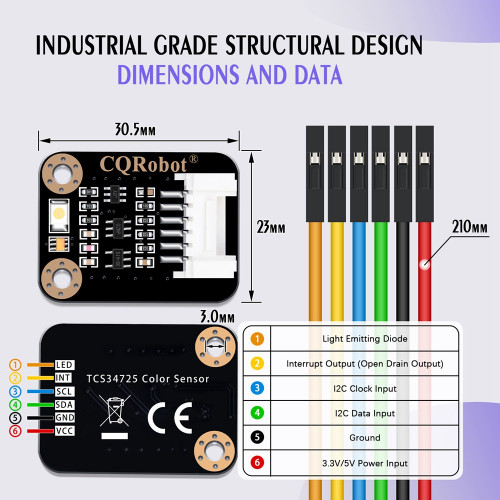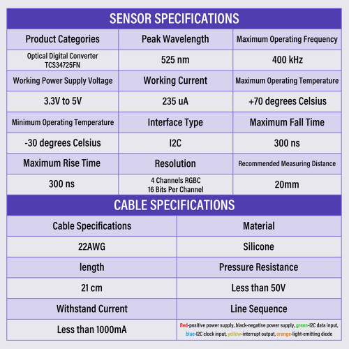 - Line Sequence: Red-Positive Power Supply; Black-Negative Power Supply; Green-I2C Data Input; Blue-I2C Clock Input; Yellow-Interrupt Output; Orange-Light Emitting Diode.