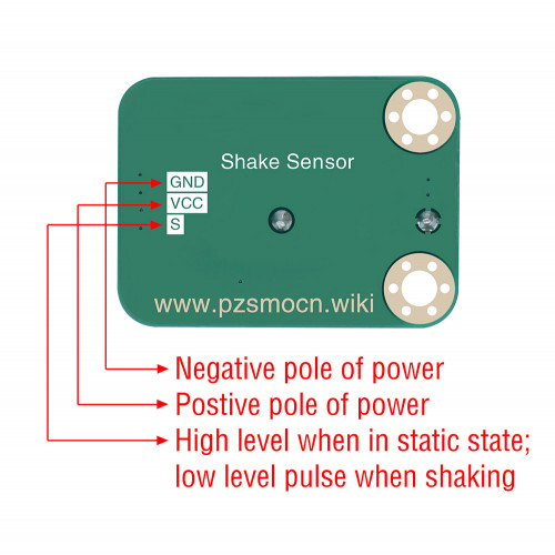 - Wire Sequence: Black-Negative power supply, Red-Positive power supply, Green-Digital signal output (Stand still - High level, Shaking - Low-level pulse)