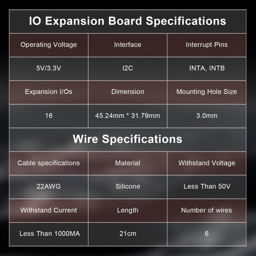 MCP23017 IO Expansion Board expands 2 signal pins as 16 I/O pins based on the I2C bus, up to 8 MCP23017 IO Expansion Board can be used at the same time, providing up to 128 I/O pins, it is compatible with both 3.3V and 5V levels.