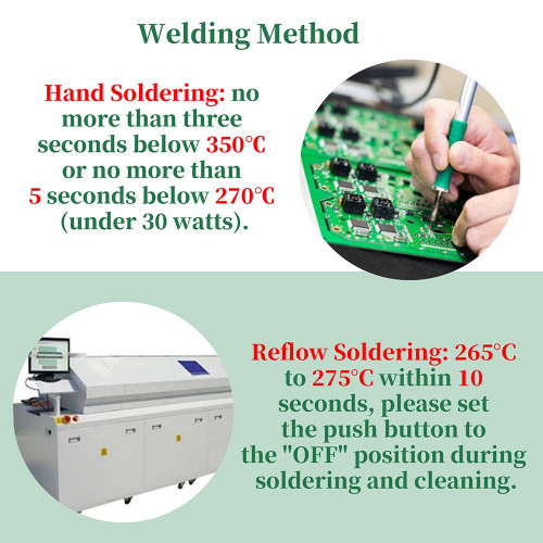 - Reflow Soldering: 265°C to 275°C within 10 seconds, please set the push button to the "OFF" position during soldering and cleaning.