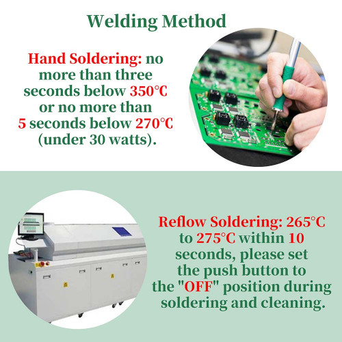 - Reflow Soldering: 265°C to 275°C within 10 seconds, please set the push button to the "OFF" position during soldering and cleaning.