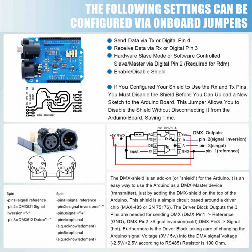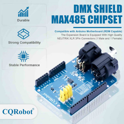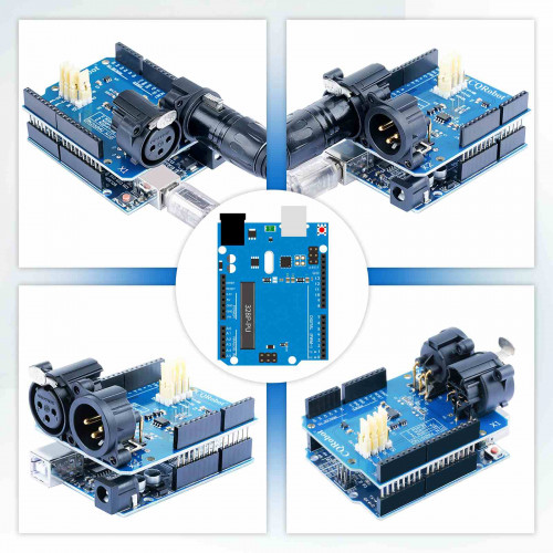 This DMX / RDM Shield is a low cost high quality solution that allows you to connect your Arduino driven artwork into DMX512 networks. The shield is populated with high quality NEUTRIK XLR 3pin Connectors (1x male and 1x female). The MAX485 based shield can be used as DMX Master, Slave and as RDM transponder.A unique RDM device id will be handed out from out range to you as well, this will make your device worldwide unique.
