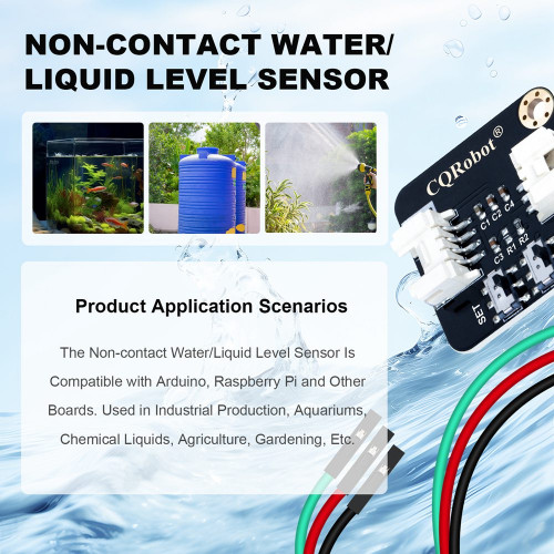 CQRobot Non-contact type liquid level sensor, It utilizes advanced signal processing technology by using a powerful chip with high-speed operation capacity to achieve non-contact liquid level detection. No contact with liquid makes the module suitable for hazardous applications such as detecting toxic substances, strong acid, strong alkali and all kinds of liquid in an airtight container under high pressure. Connect the sensor's 3-Pin cable directly to the microcontroller, such as the Arduino motherboard, and the signal terminal (Green Line) collects digital signals to determine if the sensor senses liquid. At the same time, the sensor is also compatible with the Raspberry Pi motherboard, we provide the corresponding Raspberry Pi connection method and test code.
