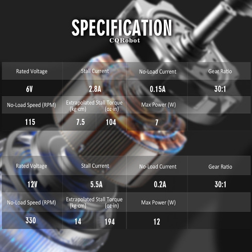 - No-load Speed @ 6V: 115 rpm; No-load Speed @ 12V: 330 rpm;