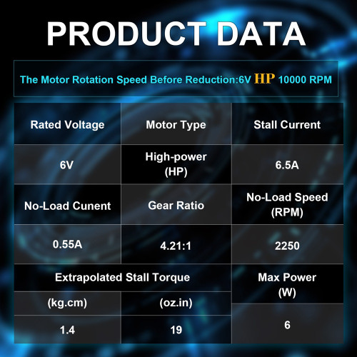 - Motor Type: 6.5A stall @ 6V (High Power 6V);