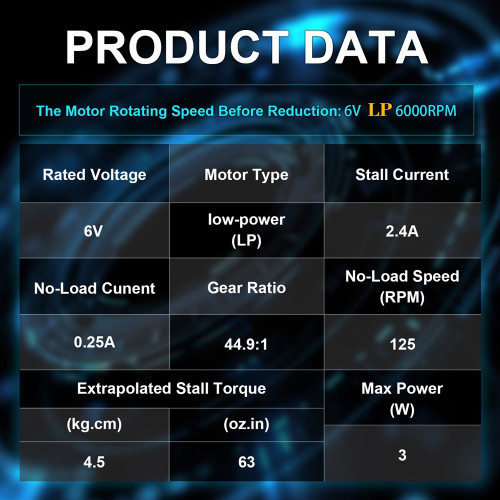 - No-load Speed @ 6V: 125 rpm;