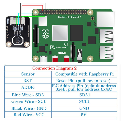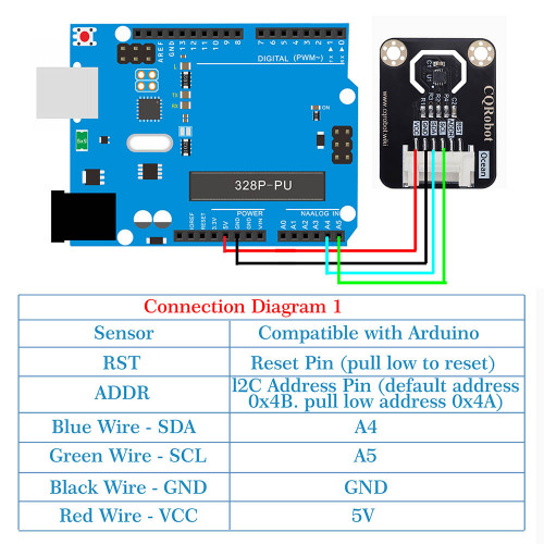 - Line Sequence: Black-Negative Power Supply; Red-Positive Power Supply; Green-SDA; Blue-SCL; Yellow-ADDR; Orange-RST.