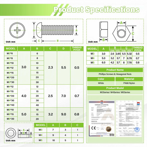 M5*15 mm White Nylon Screws and Nuts Kit with Washers(150 Pieces/50 Sets)