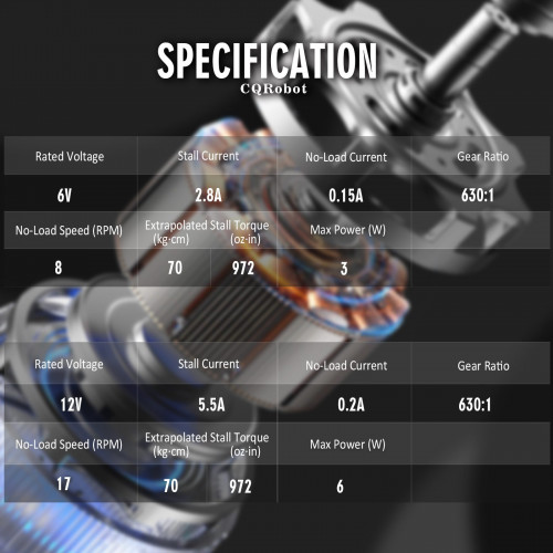 - No-load Speed @ 6V: 8 rpm; No-load Speed @ 12V: 17 rpm;
